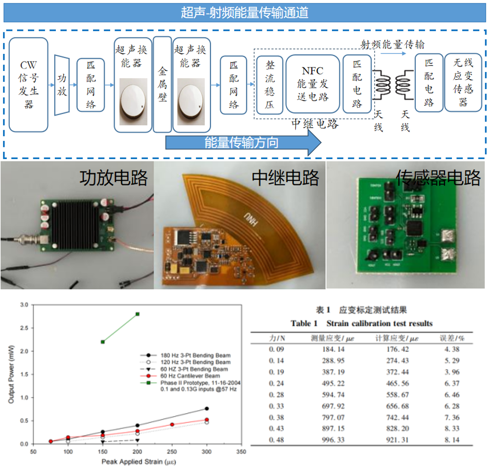 在工业机器人、航空航天、土木建筑、桥梁隧道等领域中,负责测量、控制、监测的电子设备的供电问题一直是一个亟待解决的难题。本课题组针对该问题展开了大量的探索和研究,提出了一种新颖的无线能量传输技术,即基于超声-射频中继的无线能量传输技术,该技术能够为极端金属环境下的电子设备提供毫瓦级的能量,有效解决了这些设备的供电问题。与此同时,考虑到环境中本身存在很多能量,本课题组对能量自拾取技术进行了深入的探索,尤其是对于环境中的振动能量采集技术进行了相关的研究,该技术通过收集电子设备所处环境中的能量为其供电,也是一种解决复杂环境中电子设备供电问题的有效思路。