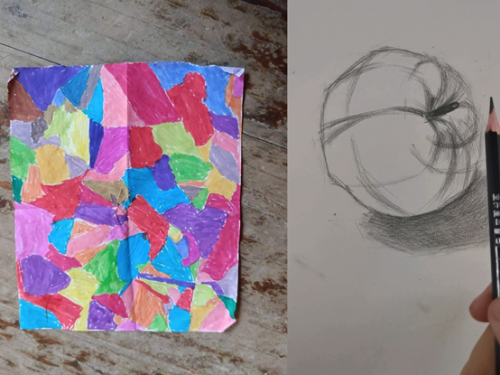中国传统文化博大精深,发扬其能增强国人的骨气和底气;外来文化恣意多样,借鉴其能展现国人的开放与包容。绘画课以“提升素养,促进体验“为指导,团队成员给孩子们普及了国内外艺术文化遗产以增强其文化自信与艺术素养,丰富其课余生活。国画和版画是中国传承千年的传统艺术形式,油画是西洋画的主要画种之一,中国油画最早起源于距今400年前,团队队员分别讲解了它们的悠久历史及经典佳作,向孩子们普及不同种类的视觉艺术形式的产生方法及传承名人,展现出不同来源、不同文化底蕴、不同表现形式、不同绘画方法的画种的艺术魅力。在与孩子们共同商议后,团队成员带领孩子们进行创意绘画并学习结构素描。在的“小老师“的一步步带领下,孩子们都拿出纸笔学习每一个步骤。创意绘画没有条件限制,孩子们把纸张随意折皱然后沿折痕描边涂色,部分孩子还画上了好看的花纹。学习结构素描时,尽管素描难度较大且孩子们只是初次接触素描,但是孩子们都认真作画、有序排线、步步扎实,最终功夫不负有心人,孩子们都基本上掌握了课上所学,完整地画出了人生中第一幅素描作品。