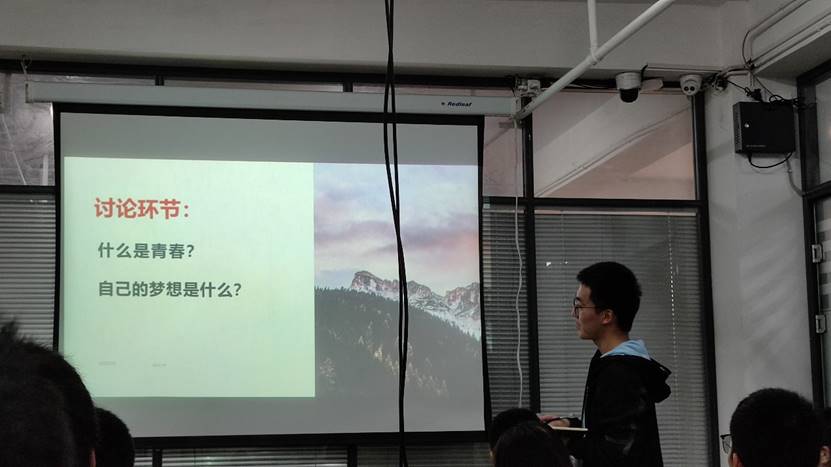 班会伊始,班长房昱硕同学通过一个“我们要筑什么梦”的问题引起同学们的思考,将大家带入探讨青春意义的氛围之中,标志着会议正式开始。随后,随着央视主持人董卿声音的响起,一部名为《青春》的短片出现在幕布之上。短片结束后,在班主任周小平老师的带领下,同学们探讨何为青春并向大家分享自己的梦想,这些对青春的理解和梦想的背后是电自2108班同学们各异但同样滚烫的灵魂。