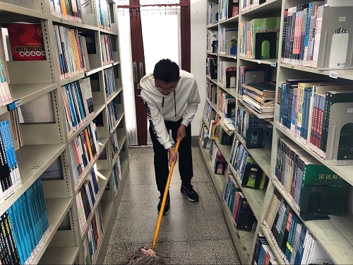 一楼的同学负责清理出破损的书籍以及为书籍贴上标签。在亲身体会了清理书籍和贴标签的辛苦之后,同学们纷纷表示以后一定会好好爱惜书籍。三楼的同学负责打扫藏书区,男生负责拖地,女生负责擦拭两层楼楼梯的扶手。书架间,楼梯上到处都有同学们忙碌的身影。虽然劳动很辛苦但和同学一起却乐在其中。大家都充分的体会到了劳动的快乐。四楼的同学负责书籍的归类摆放,摆放整齐的书籍不仅美观,还能为同学们查找书籍时带来便利。想到自己的一些小举动能为他人带来便利,同学们都体会到了志愿活动的意义。