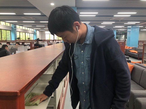 德智图书馆门口集合。经班长许丹阳清点人数之后,同学们有序地进入图书馆进行志愿者活动。同学们分为两组,由班长许丹阳、副班长李彬贤各带领一组分别前往三、四楼。与各层的楼层负责人进行交流后,同学们开始了打扫。