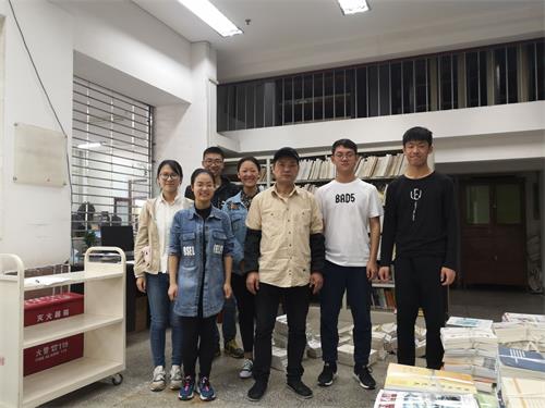 第一部分同学在第二、三两层,负责将成堆的书籍按分类摆放并搬运到仓库,第二部分的同学在第四层,负责擦拭书柜。