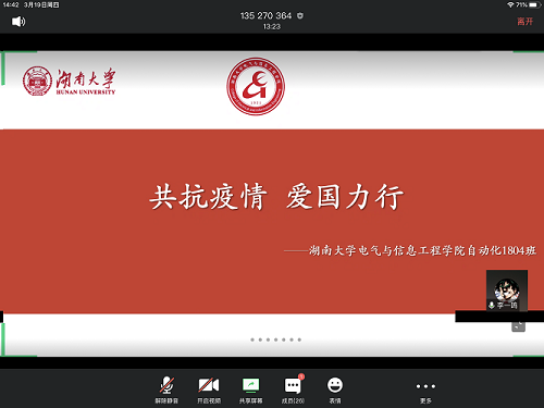 最后,班长应宇轩总结今日会议内容,同时提醒同学们一定要按照学校的要求,坚持每日准时打卡,切不能谎报行程、身体健康等情况,强调身体健康的重要性以及“停课不停学”的理念,在家自觉主动学习,期待疫情后,自动化1804班在岳麓山下重逢!