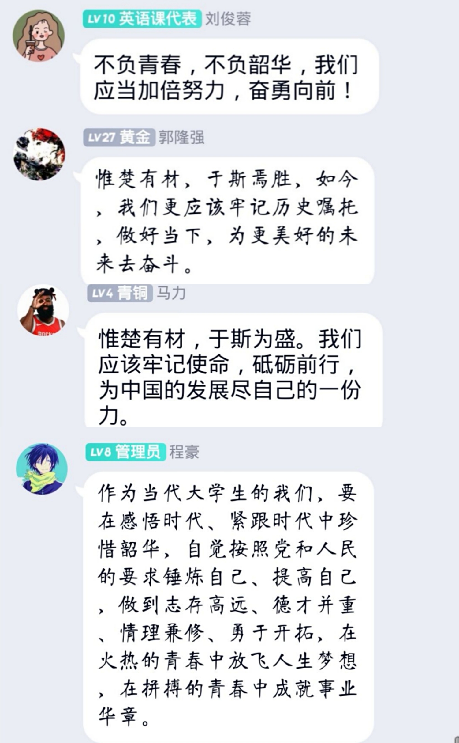 活动结束后,同学们在班级交流群中展开讨论,抒发自己的感想。程豪同学说“作为当代大学生的我们,要在感悟时代、紧跟时代中珍惜韶华,勇于开拓,在火热的青春中放飞人生梦想,在拼搏的青春中成就事业华章。”班长郭隆强同学激动地说“我们应该牢记历史嘱托,做好当下,为更加美好的未来奋斗。”张奇文同学说“我们既要学好先进的科学文化,也要传承好优秀的传统文化,努力做到笔下有华章,眼里有希望,心中有梦想。”