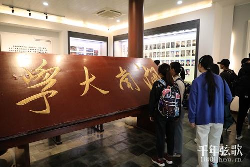 实践活动的下一站是岳麓书院历史陈列馆。到达陈列馆后,同学们四散开来,看着展柜里陈列着的书院历史。从公元976年岳麓书院创立,到1926年定名动画h