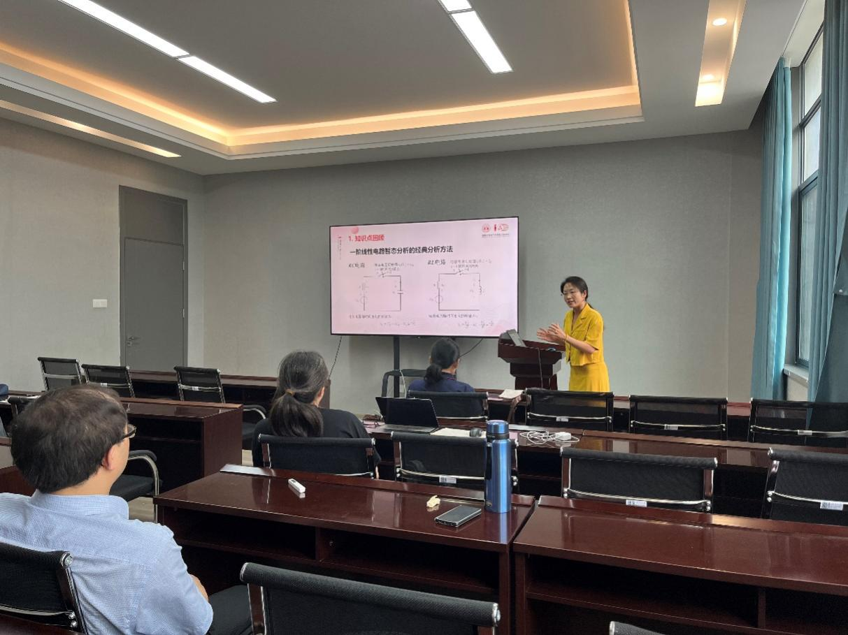 报名参加湖南省信息化教学竞赛的高兵老师以《电磁场与波信息化教学创新》为题,介绍了《电磁场与波》课程信息化建设的历程和成果,并进行了微课教学试讲;报名参加湖南省青年教师电工学课堂教学竞赛(暨第五届全国高等学校青年教师电工学课堂教学竞赛湖南省选拔赛)的张子娇、翟东媛、邓林峰三位老师,每人分别根据自己的选题内容进行了5分钟说课和20分钟的现场试讲。