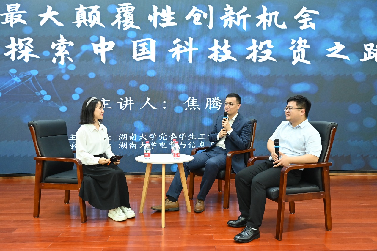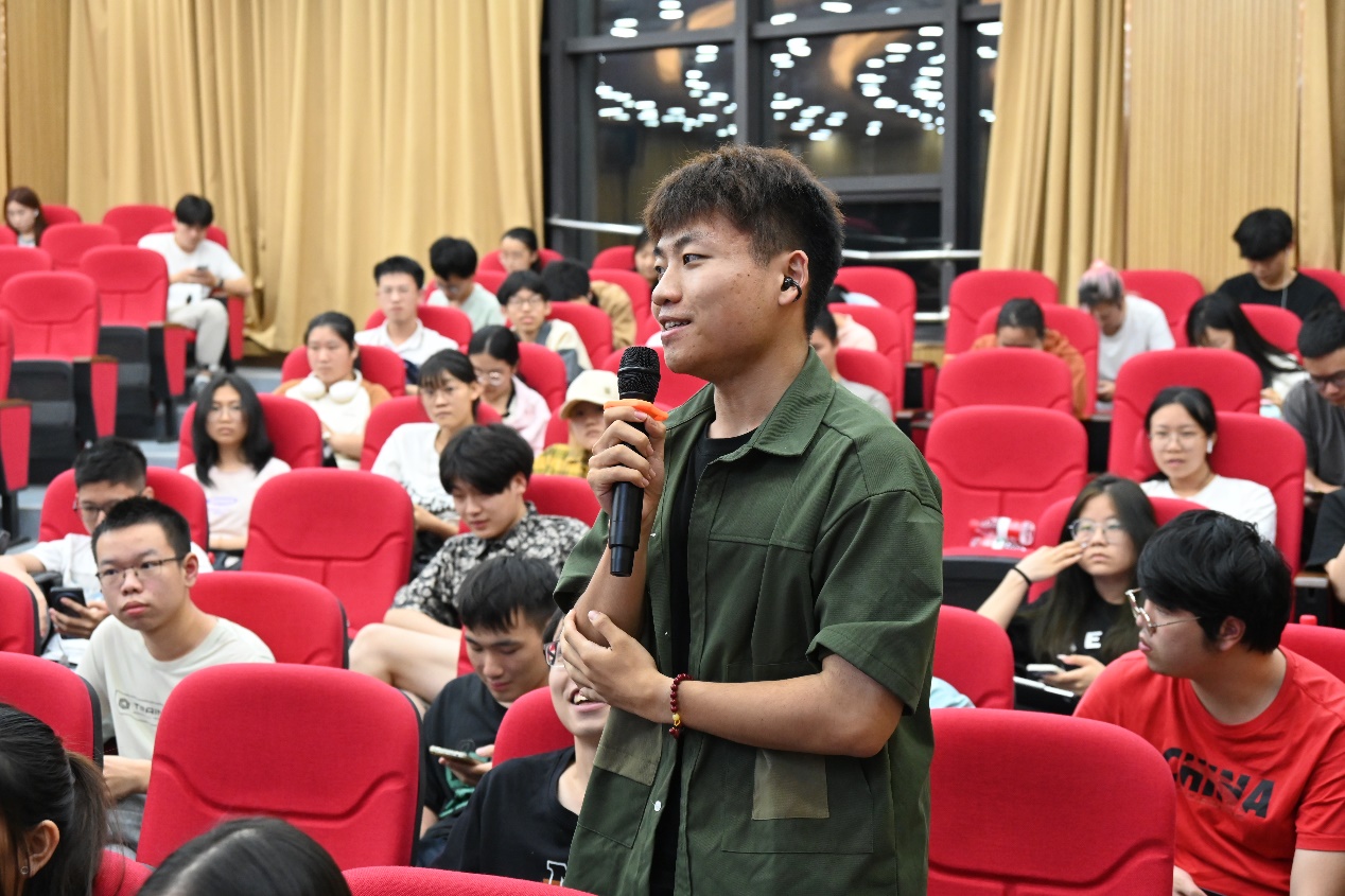 在主持人访谈和学生提问环节,焦腾和方遒围绕“复合学科背景与个人发展”“当前智能电动车市场前景”等问题,结合个人经历展开交流、为同学们答疑解惑,鼓励同学们广泛学习,尝试去了解乔布斯、马云等顶尖企业家的故事,打造自己的成长操作系统,并不断地、闭环地进行优化。