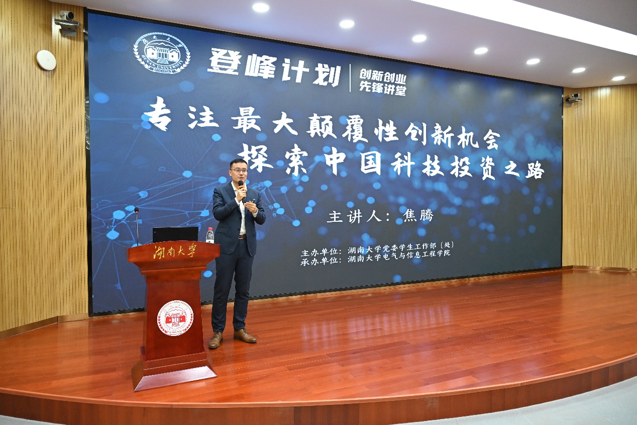 电气院2013届硕士焦腾参与“登峰计划——创新创业先锋讲堂”,在综合楼208报告厅作“专注最大颠覆性创新机会,探索中国科技投资之路”主题报告。校党委副书记孙炜、院党委书记张小刚等老师出席报告,电气院控制科学与工程系副教授方遒一同担任访谈嘉宾。